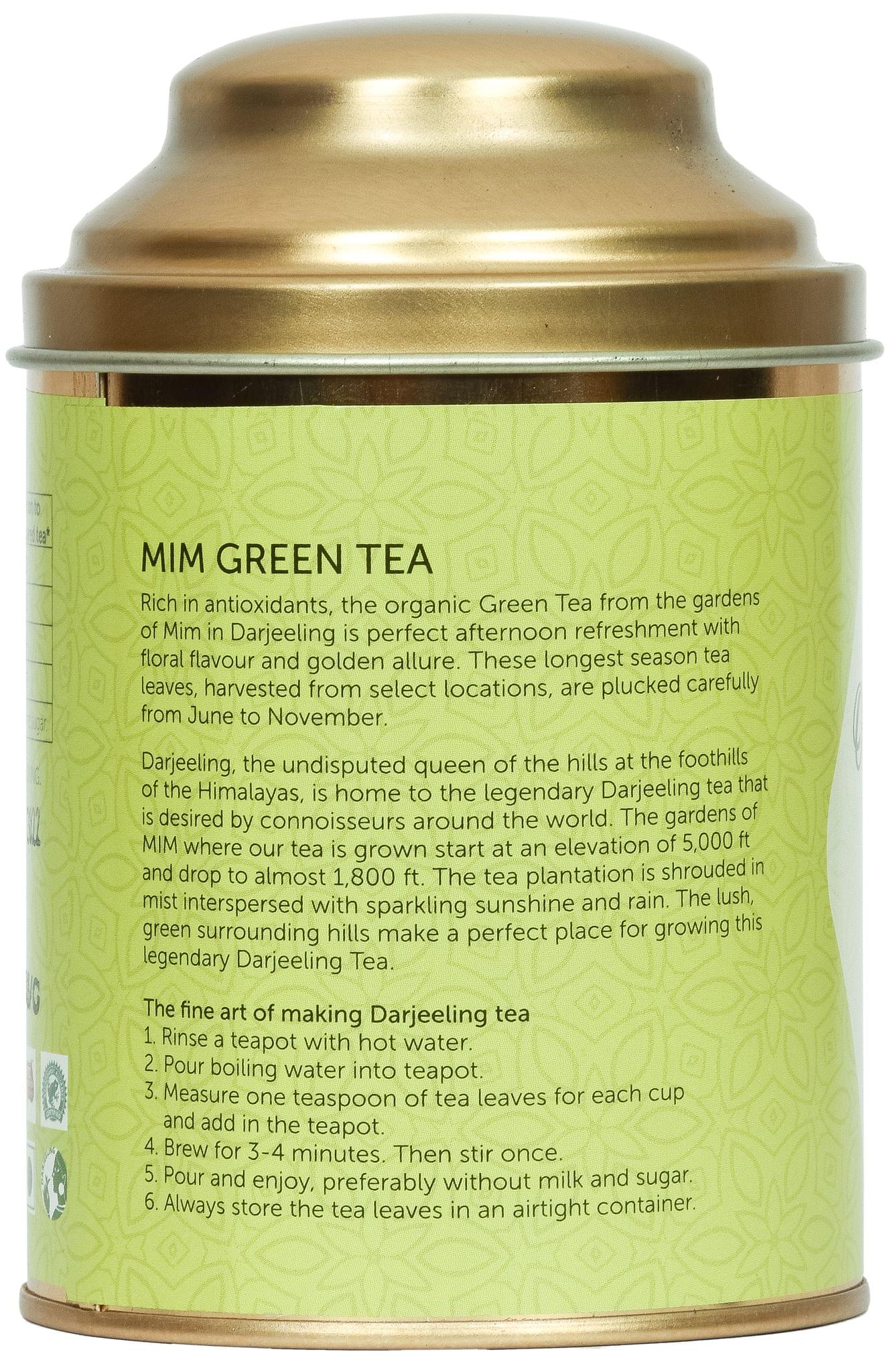 Rich in anti-oxidants, the Organic Green Tea from the gardens of Mim in Darjeeling is perfect afternoon refreshment with floral flavor and golden allure. The longest season tea leaves, harvested from select locations, are plucked carefully from June to November.
