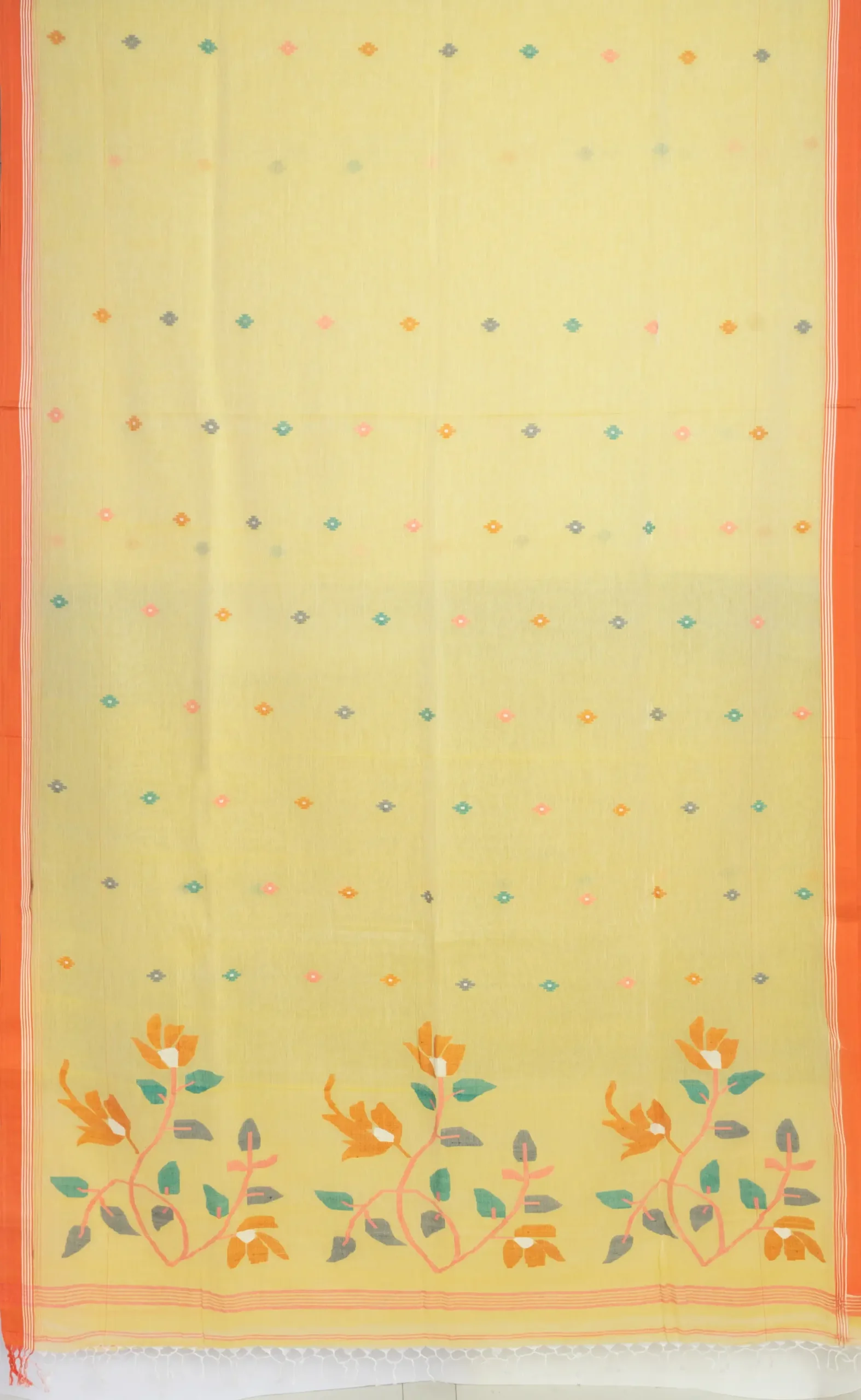 Originally made from Karpas cotton grown in the Brahmaputra hinterland, Jamdani at present is worked on cotton, cotton-silk, and pure mulberry silk. The weaving of jamdani is like tapestry work where small shuttles of coloured, gold or silver threads are passed through the weft. It’s the vibrant colours and richness of its motifs that make Jamdani stand out from among other handloom products. Handweaving Jamdani is time-consuming and labor-intensive because the motifs are created directly on the loom using the discontinuous weft technique. A highly skilled weaver takes almost eight to twelve months to weave an exquisite Jamdani saree.