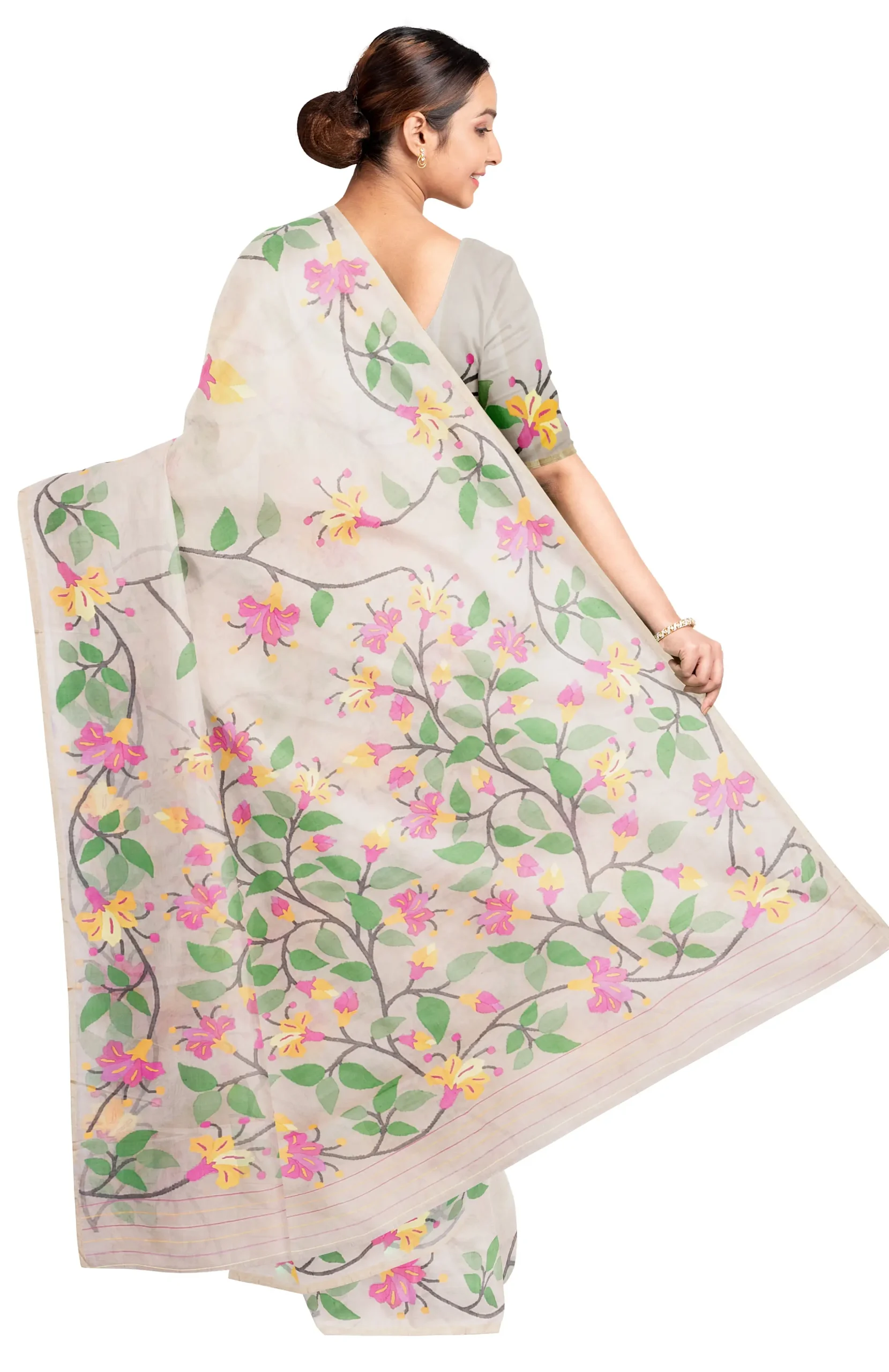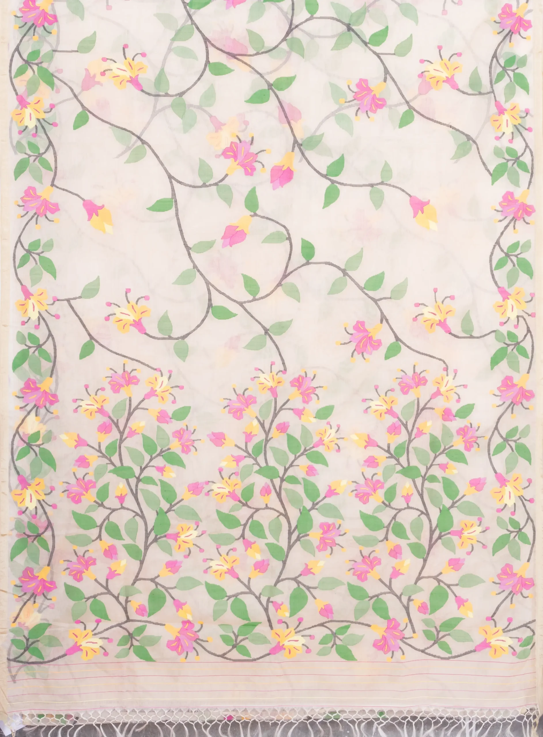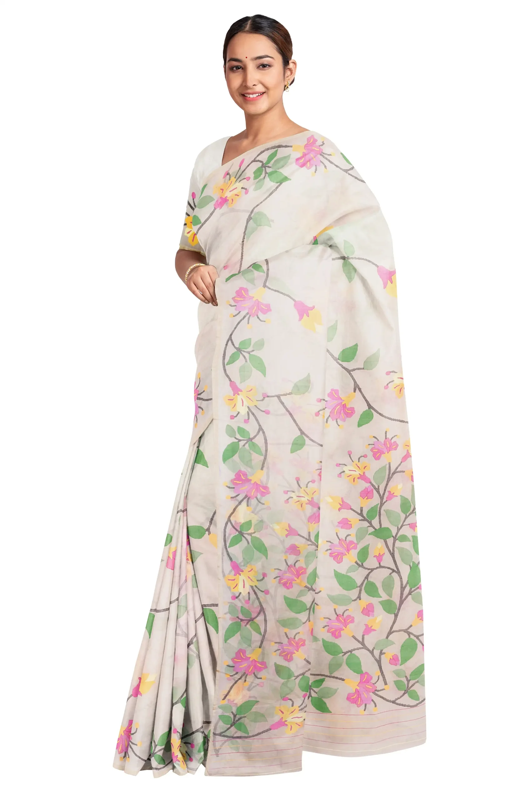 Originally made from Karpas cotton grown in the Brahmaputra hinterland, Jamdani at present is worked on cotton, cotton-silk and pure mulberry silk. The weaving of jamdani is like tapestry work where small shuttles of coloured, gold or silver threads are passed through the weft. It’s the vibrant colours and richness of its motifs that make Jamdani stand out from among other handloom products. Handweaving Jamdani is time-consuming and labour-intensive because the motifs are created directly on the loom using the discontinuous weft technique. A highly skilled weaver takes almost eight to twelve months to weave an exquisite Jamdani saree.