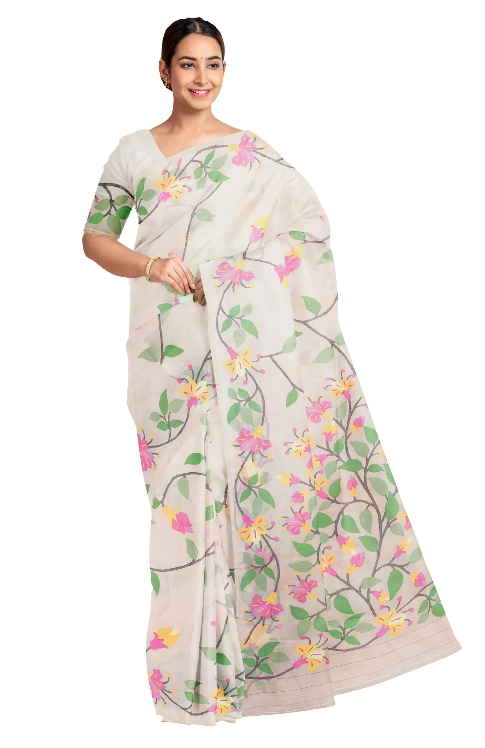 The name Jamdani is a compound word wherein “jam” means flower and “dani” means vase. The name is suggestive of the beautiful floral motifs that adorn these gorgeous sarees.