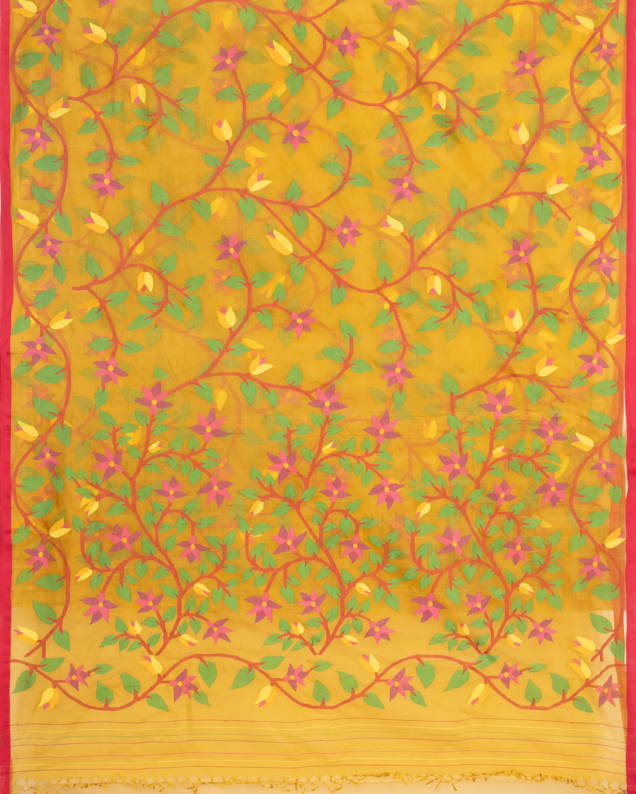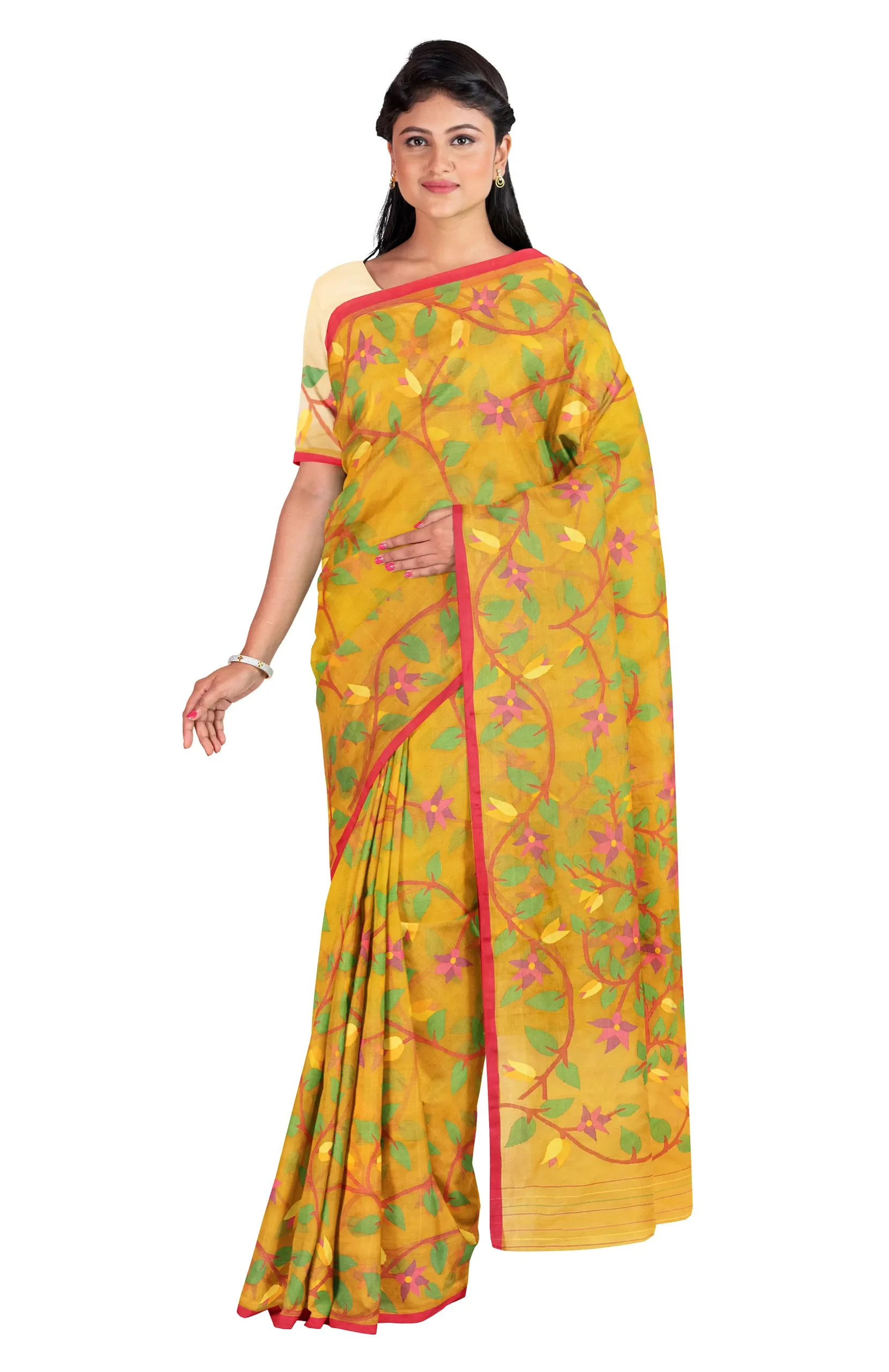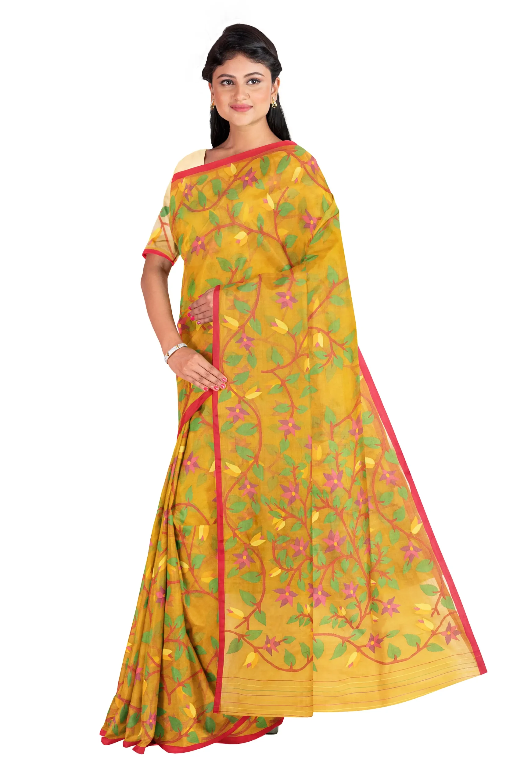 The name Jamdani is a compound word wherein “jam” means flower and “dani” means vase. The name is suggestive of the beautiful floral motifs that adorn these gorgeous sarees.