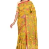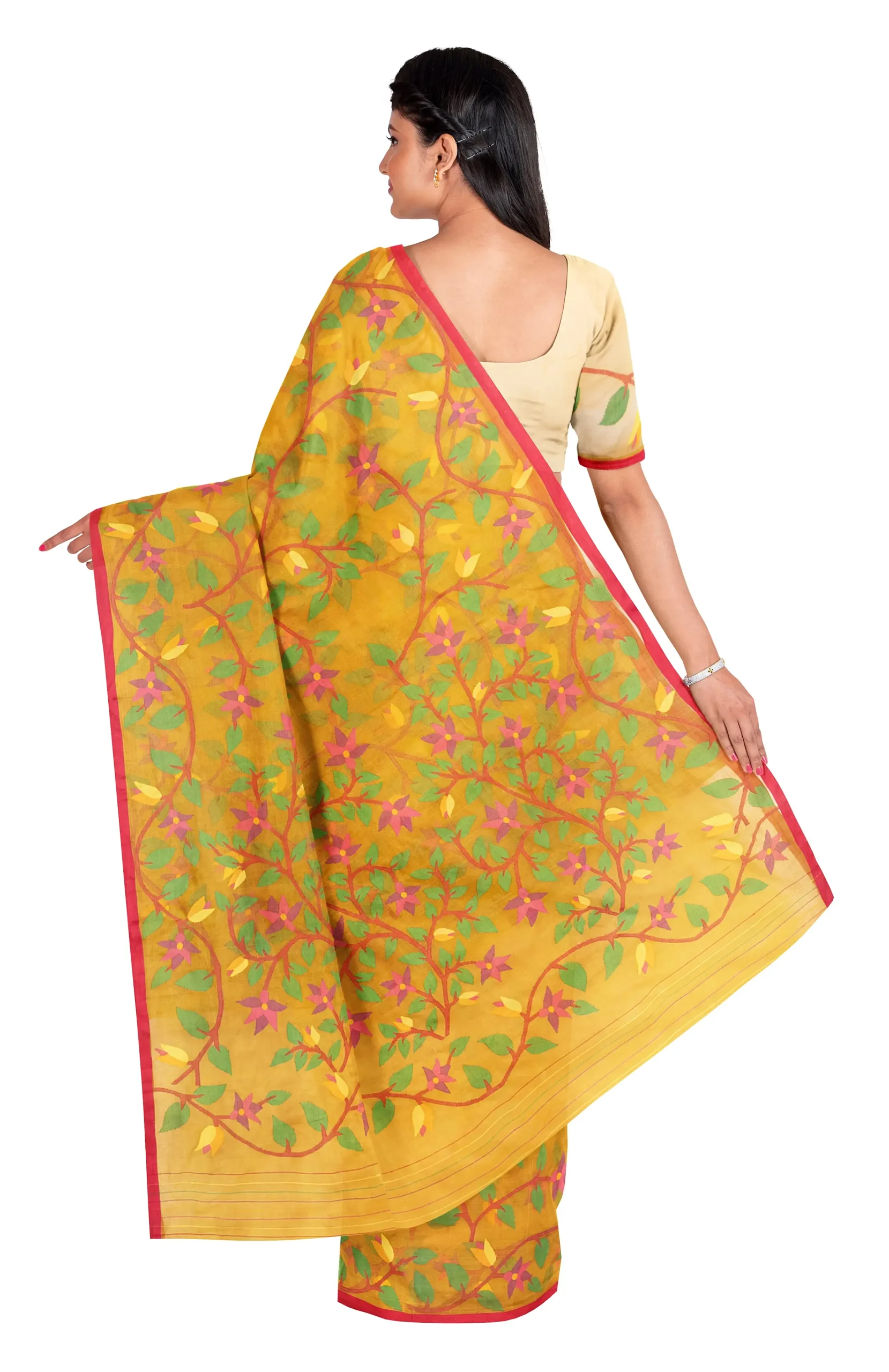 Originally made from Karpas cotton grown in the Brahmaputra hinterland, Jamdani at present is worked on cotton, cotton-silk and pure mulberry silk. The weaving of jamdani is like tapestry work where small shuttles of coloured, gold or silver threads are passed through the weft. It’s the vibrant colours and richness of its motifs that make Jamdani stand out from among other handloom products. Handweaving Jamdani is time-consuming and labour-intensive because the motifs are created directly on the loom using the discontinuous weft technique. A highly skilled weaver takes almost eight to twelve months to weave an exquisite Jamdani saree.