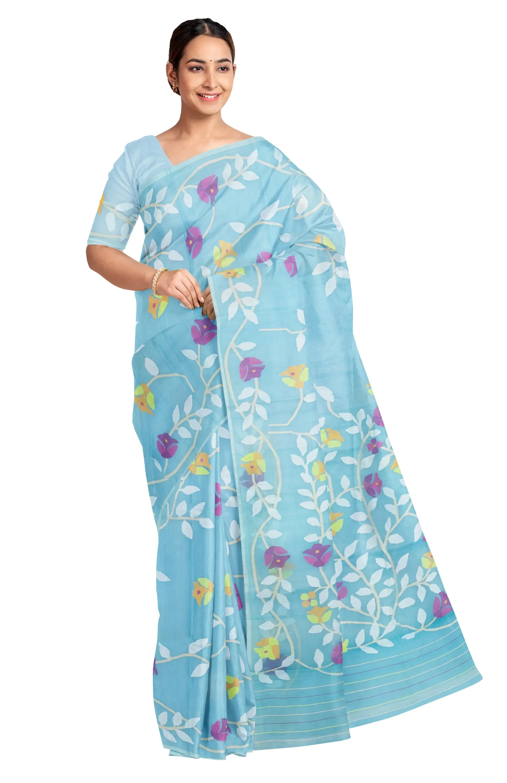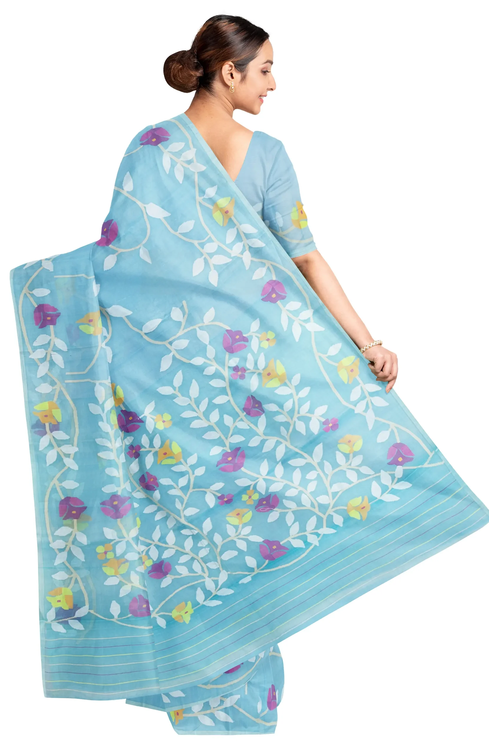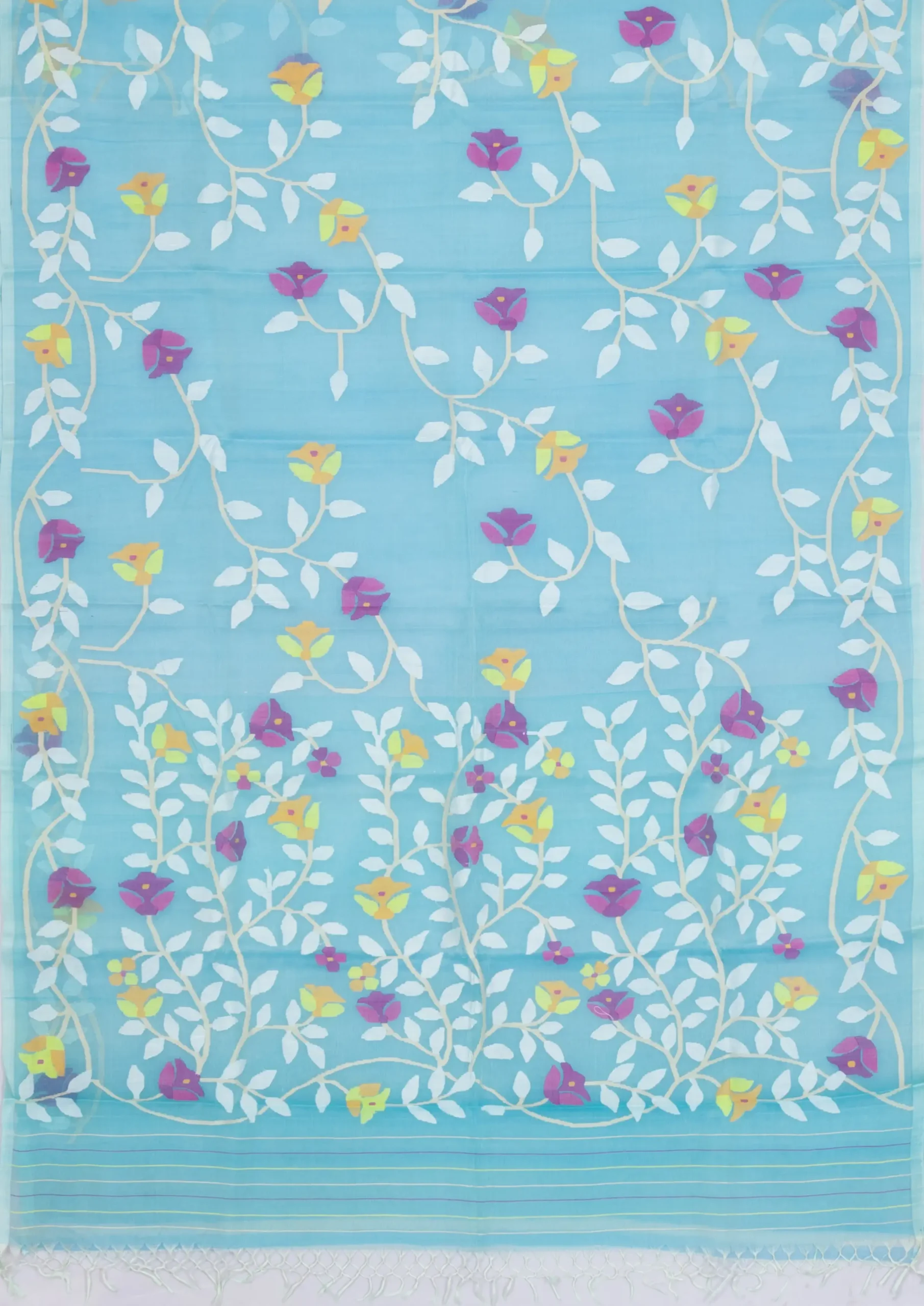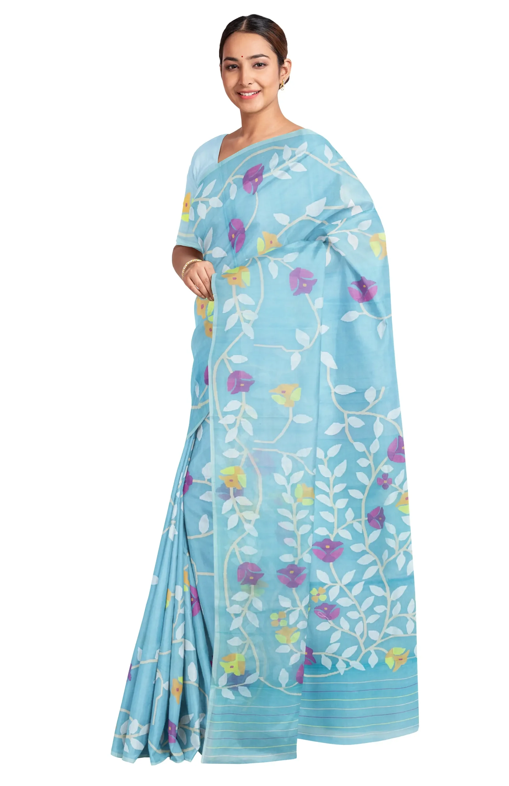 Originally made from Karpas cotton grown in the Brahmaputra hinterland, Jamdani at present is worked on cotton, cotton-silk and pure mulberry silk. The weaving of jamdani is like tapestry work where small shuttles of coloured, gold or silver threads are passed through the weft. It’s the vibrant colours and richness of its motifs that make Jamdani stand out from among other handloom products. Handweaving Jamdani is time-consuming and labour-intensive because the motifs are created directly on the loom using the discontinuous weft technique. A highly skilled weaver takes almost eight to twelve months to weave an exquisite Jamdani saree.